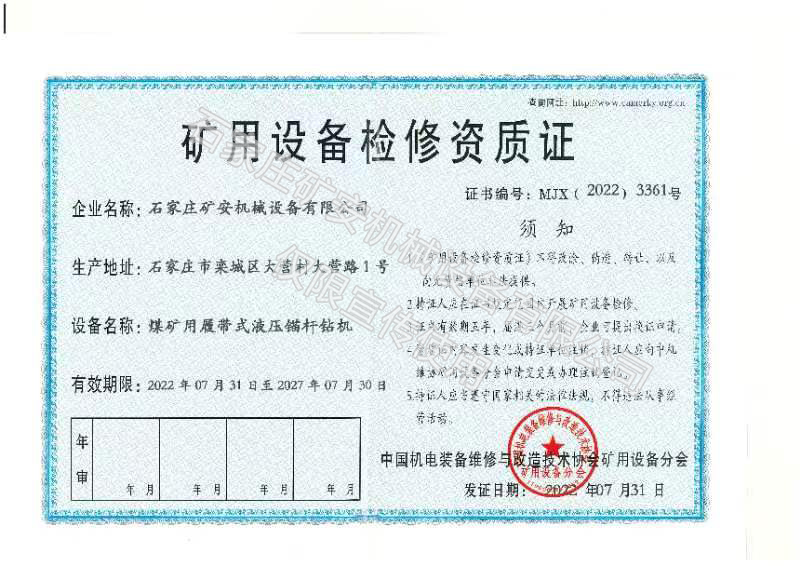 石家莊礦安機械設備有限公司成立于2011年3月,公司位于風景優(yōu)美、科技發(fā)達、交通便利的石家莊市欒城區(qū),是一家專注生產(chǎn)煤礦井下支護機具(錨桿鉆機)和安全鉆機(防突,架柱等)及氣動隔膜泵等礦用機械設備的********,是國內煤礦機械裝備的生產(chǎn)商和服務商,根據(jù)用戶需求提供井下適用的鉆機施工解決方案。公司致力于打造研發(fā)、制造、銷售、服務為一體的現(xiàn)代化企業(yè),全心全意為煤礦生產(chǎn)保駕護航。 ? 公司建有裝配車間、機加車間和調試車間,擁有嚴格的質量控制體系、先進的產(chǎn)品開發(fā)系統(tǒng)、完善的試驗檢測設施、良好的售后服務保障。先后與中煤科工集團沈陽研究院、西安研究院、太原理工大學、燕山大學等知名院校建立了緊密的合作關系。 ? 公司產(chǎn)品主要銷往山西、陜西、山東、內蒙古、黑龍江、云南、貴州等七十多個礦區(qū)和地方煤礦,擁有一支成熟的售后技術團隊,并且和中煤集團、華電煤業(yè)集團、華潤煤業(yè)集團、潞安集團、山西焦煤、淮北礦業(yè)等國內知名企業(yè)達成長期合作關系。 ? 公司始終秉持“讓煤礦生產(chǎn)更安全”的發(fā)展使命,力求誠信與創(chuàng)新,追求卓越與完美,深知“實實在在、心無旁騖做實業(yè)”,這才是本分!石家莊礦安機械設備有限公司愿與您攜手共進,共同發(fā)展!為客戶創(chuàng)造價值,提供優(yōu)質的產(chǎn)品和*佳的服務是我們永無止境的理念!